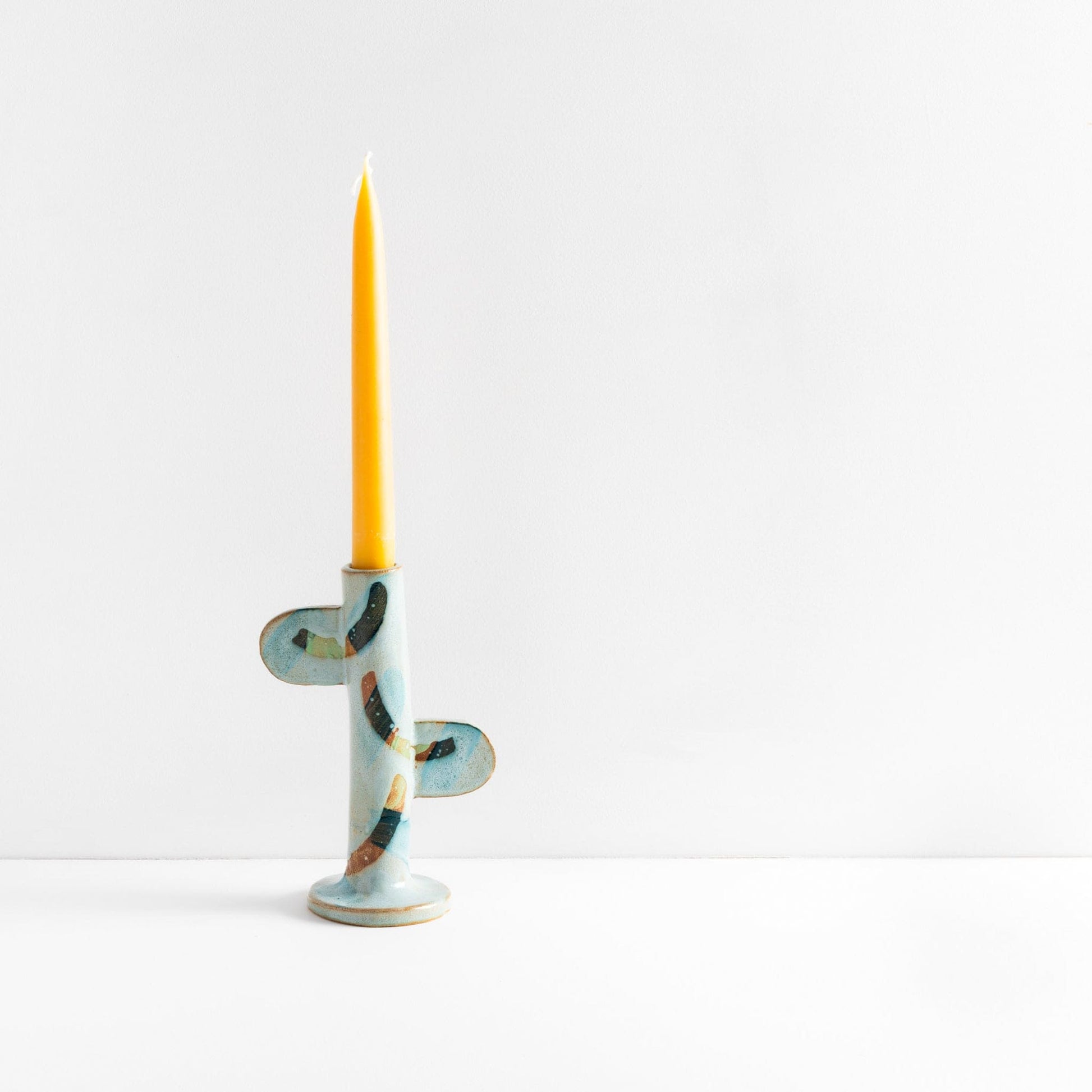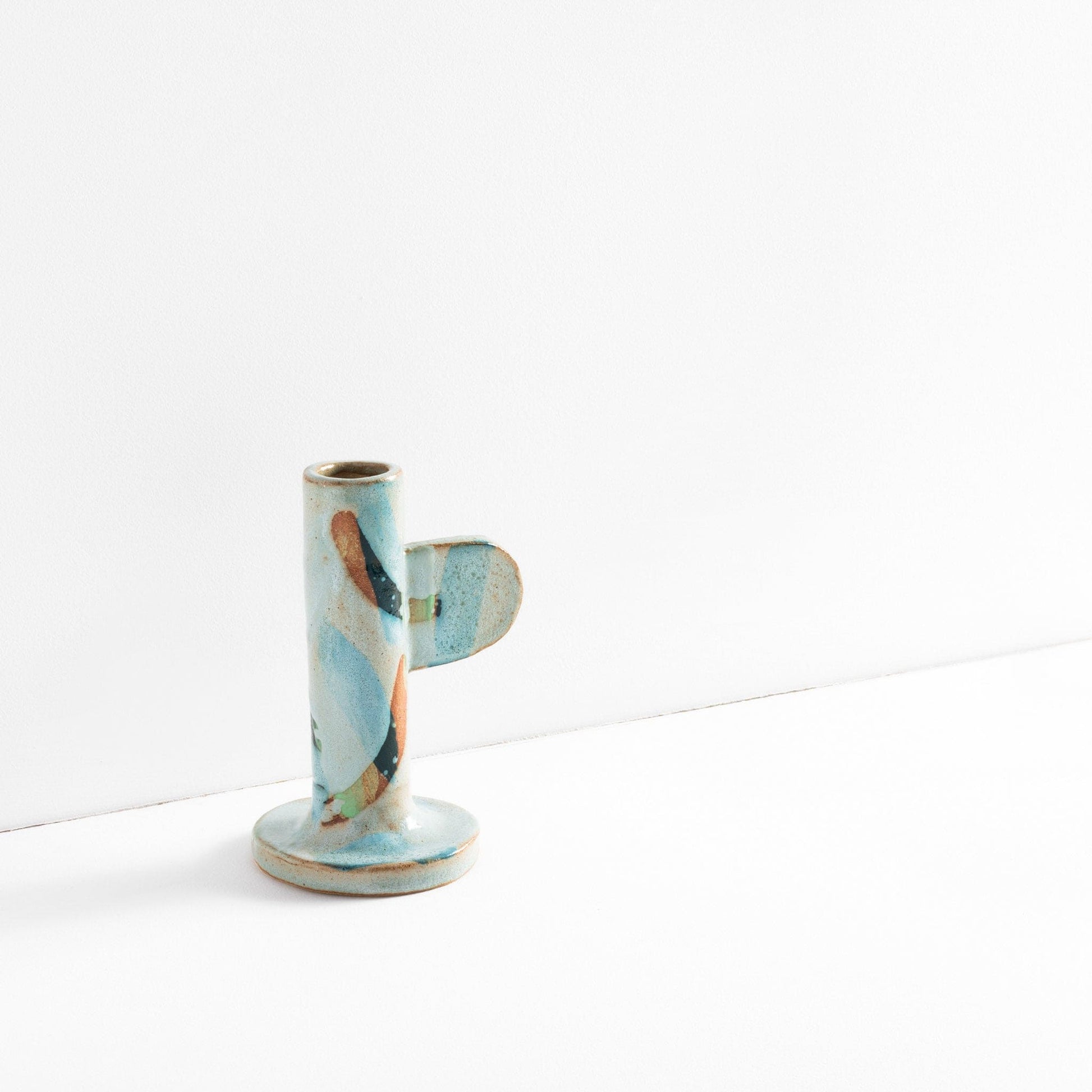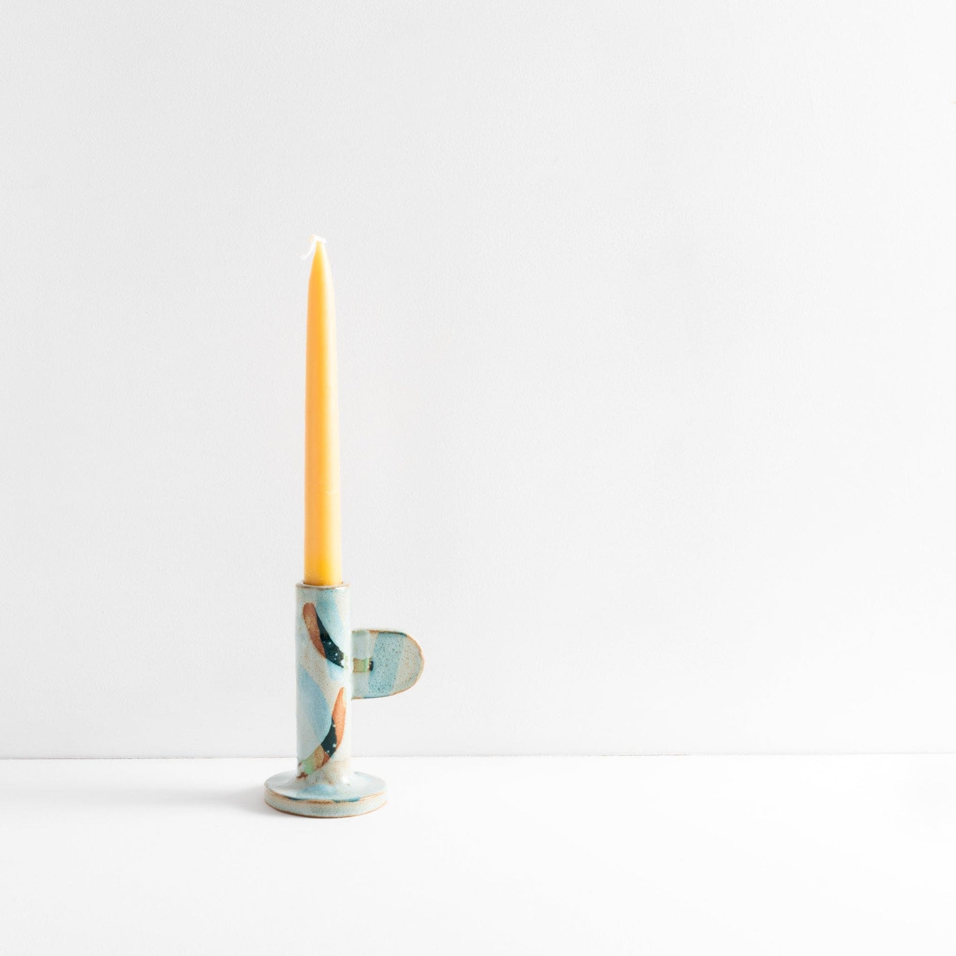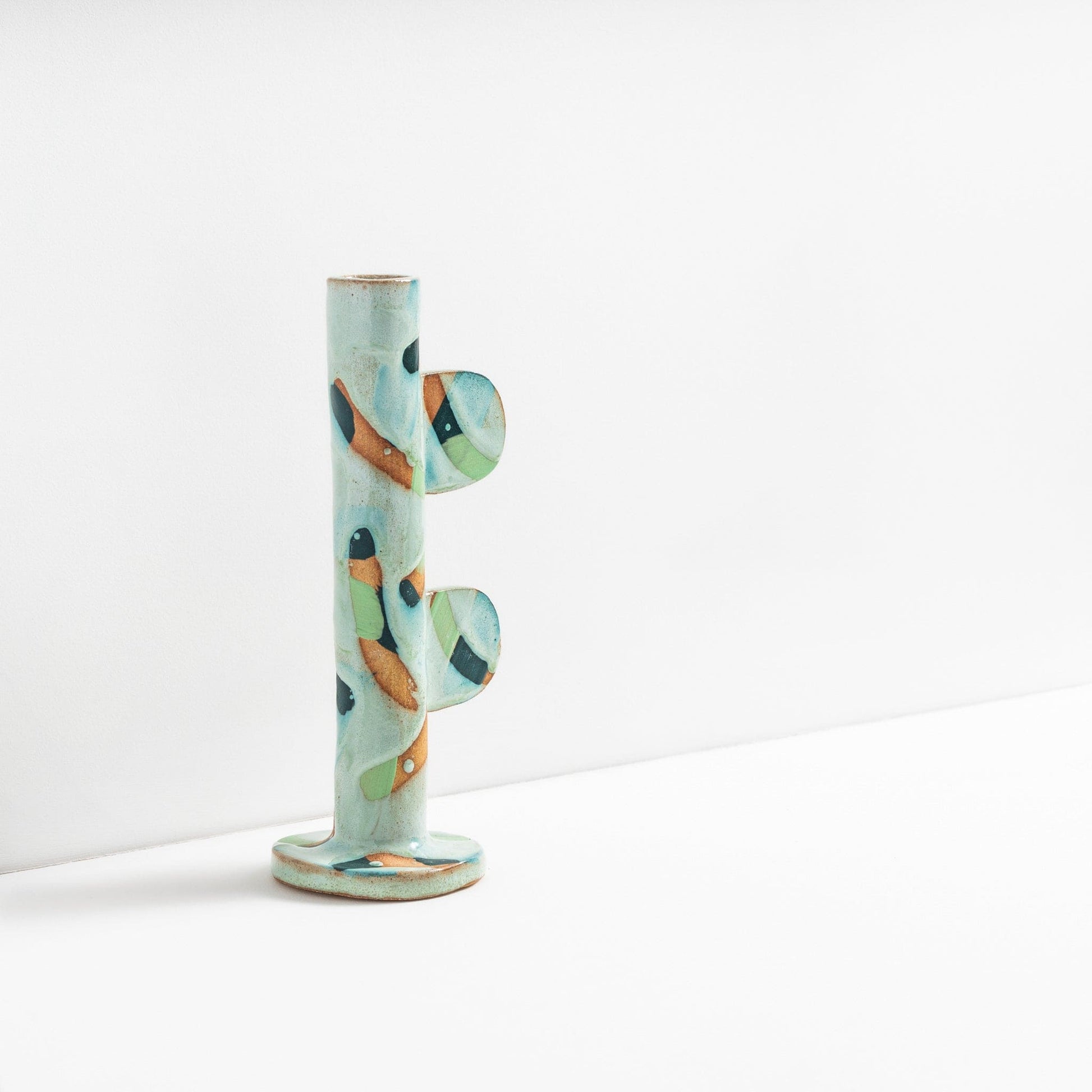 Ceramic stoneware candlestick holder with teal glaze, coloured slips and wax resist design. Handmade at Common Clay studio.