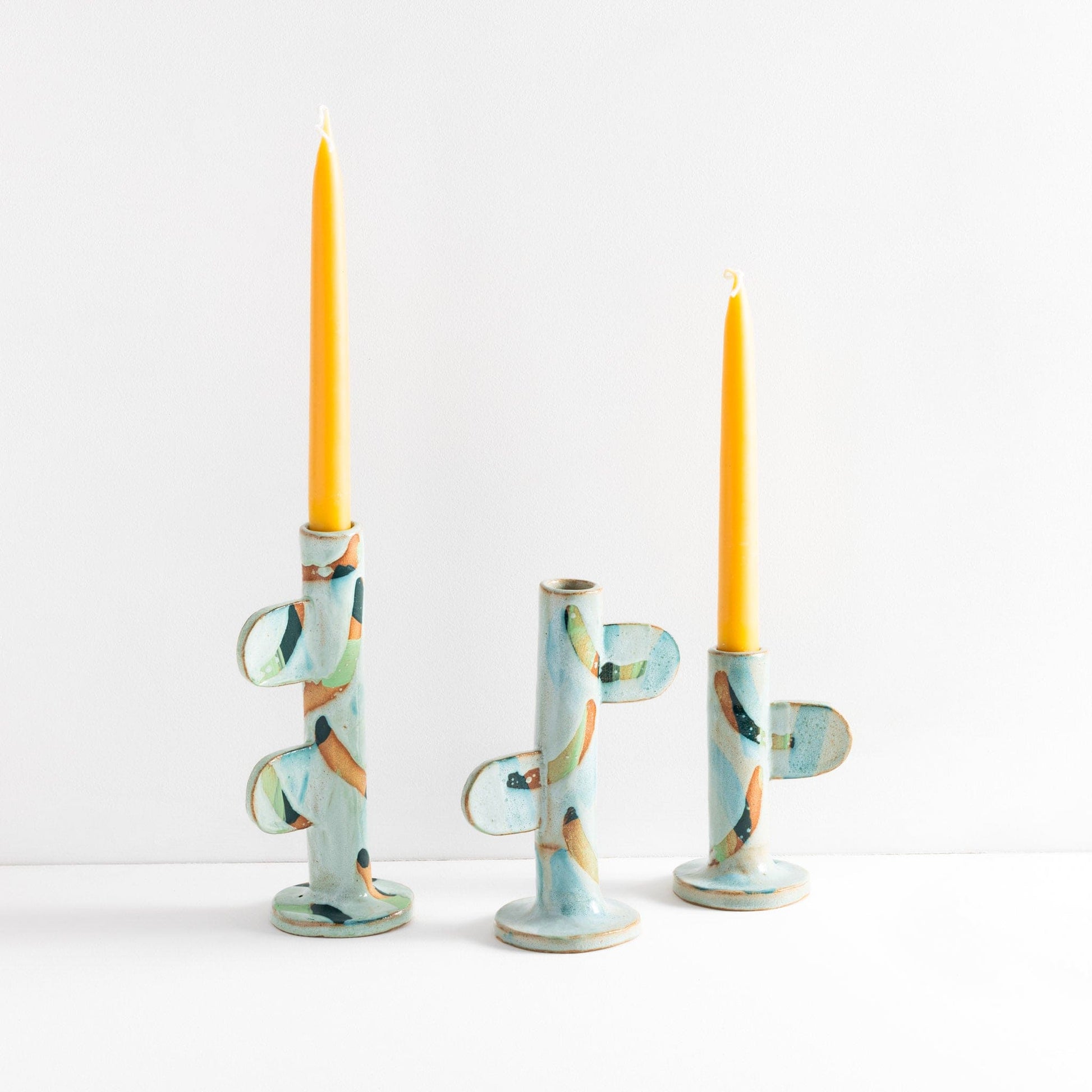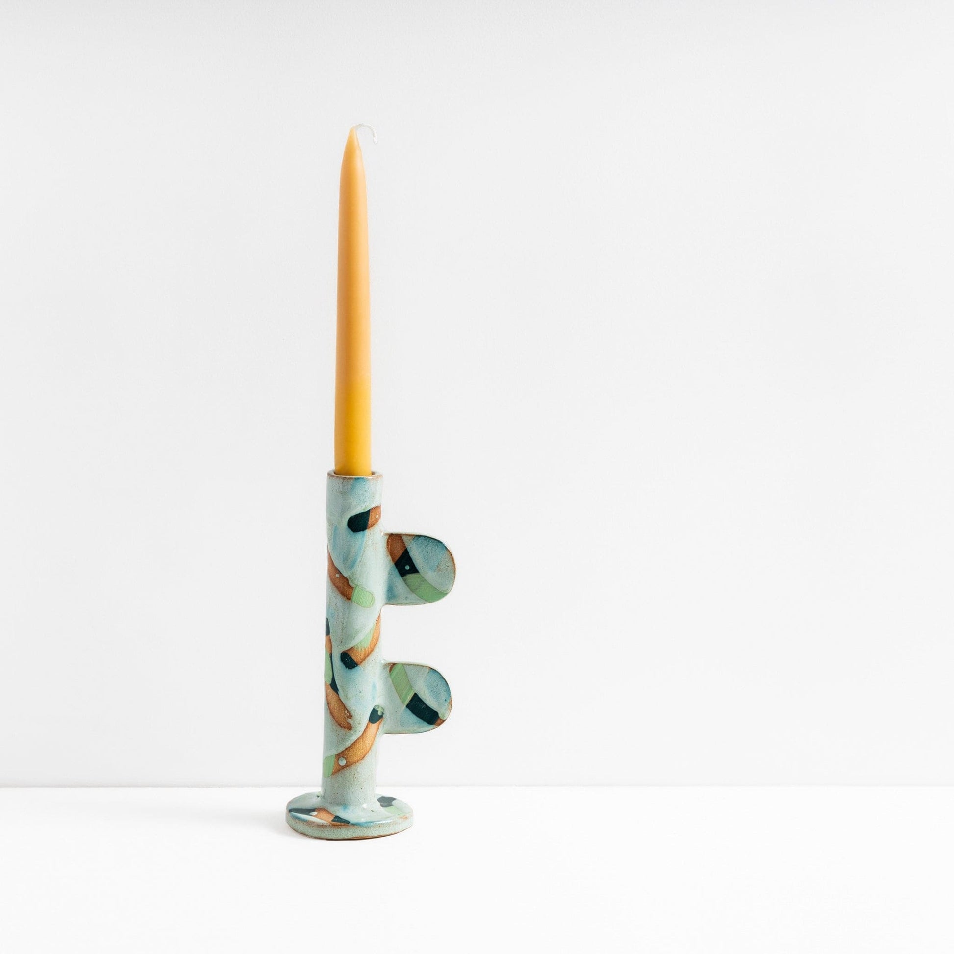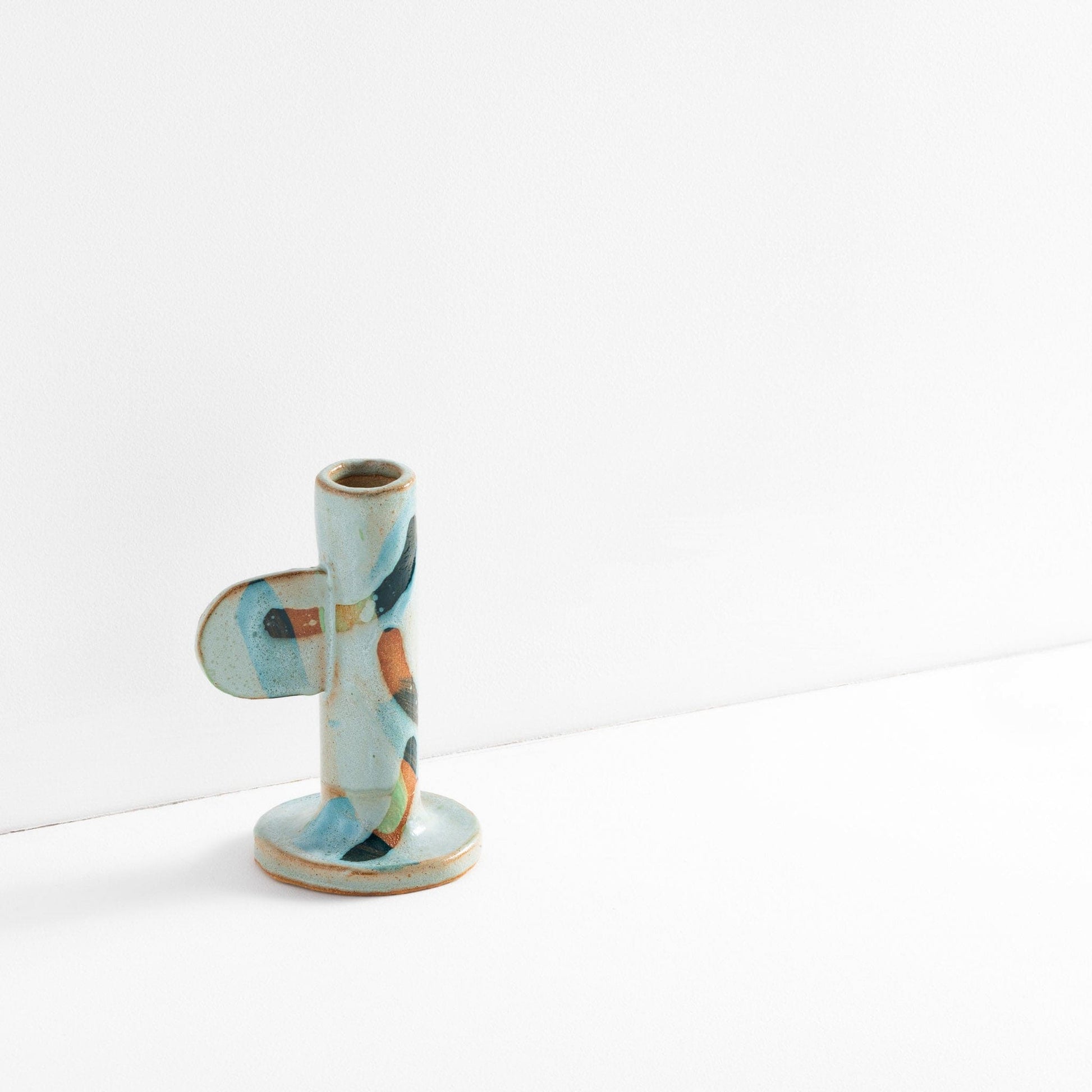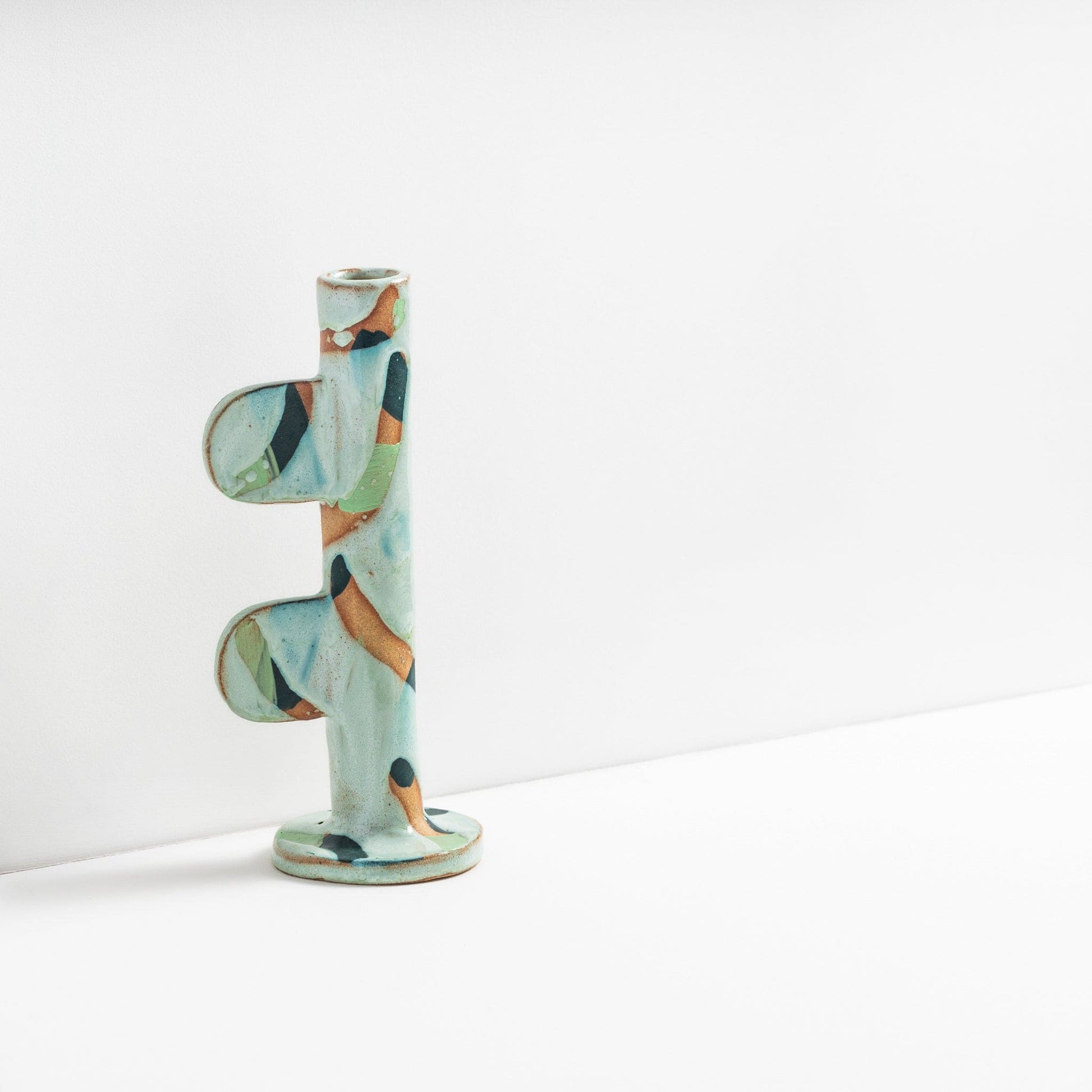 Ceramic stoneware candlestick holder with teal glaze, coloured slips and wax resist design. Handmade at Common Clay studio.