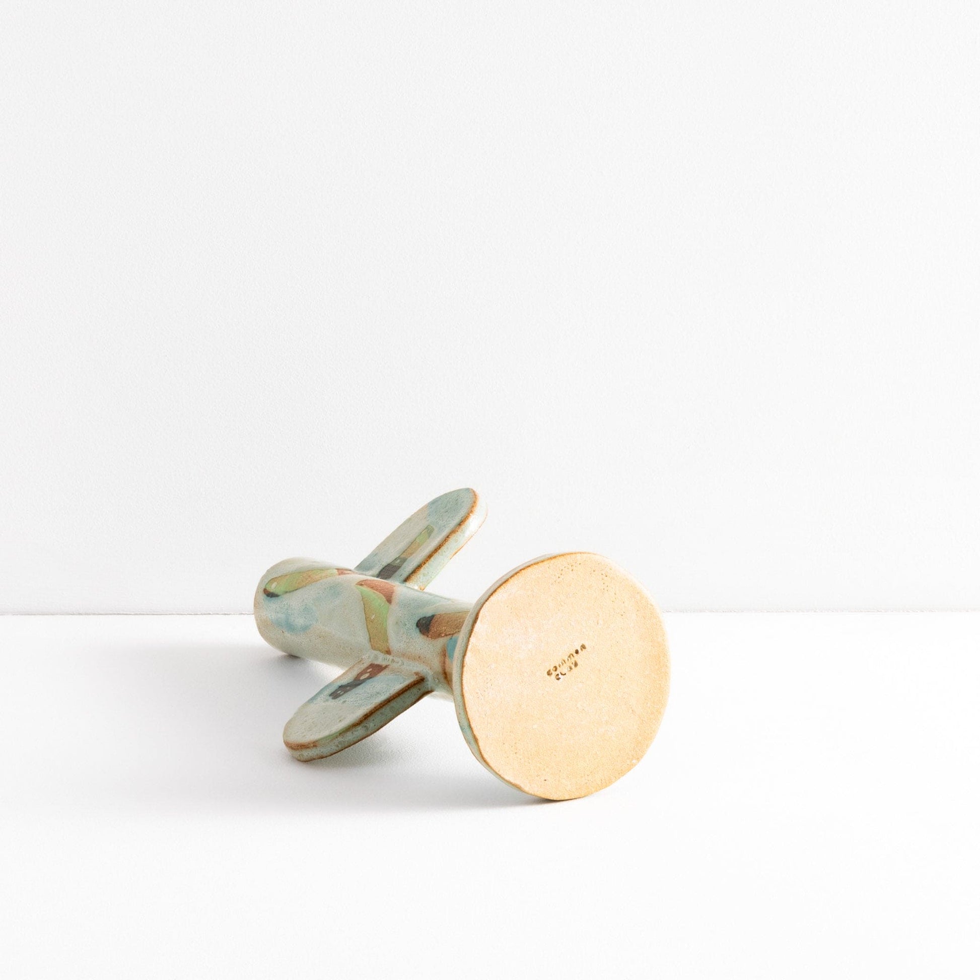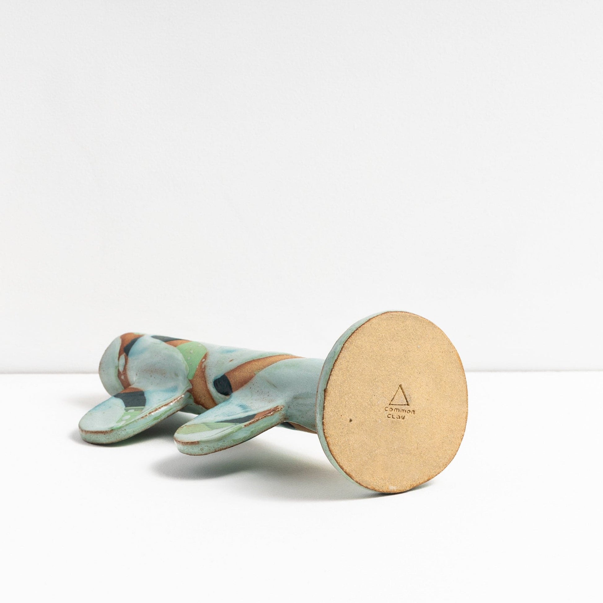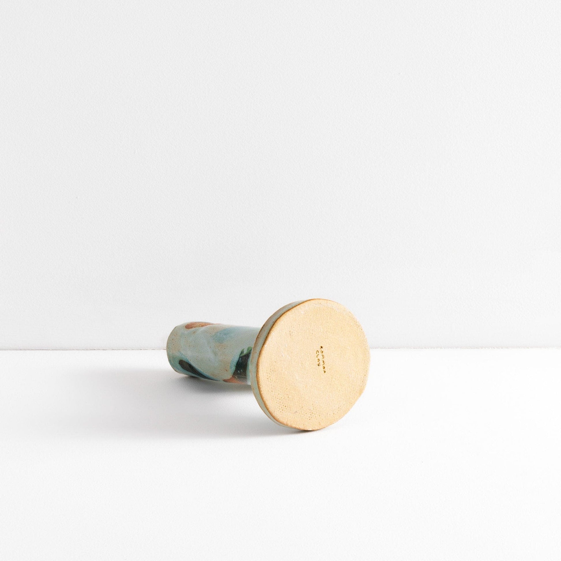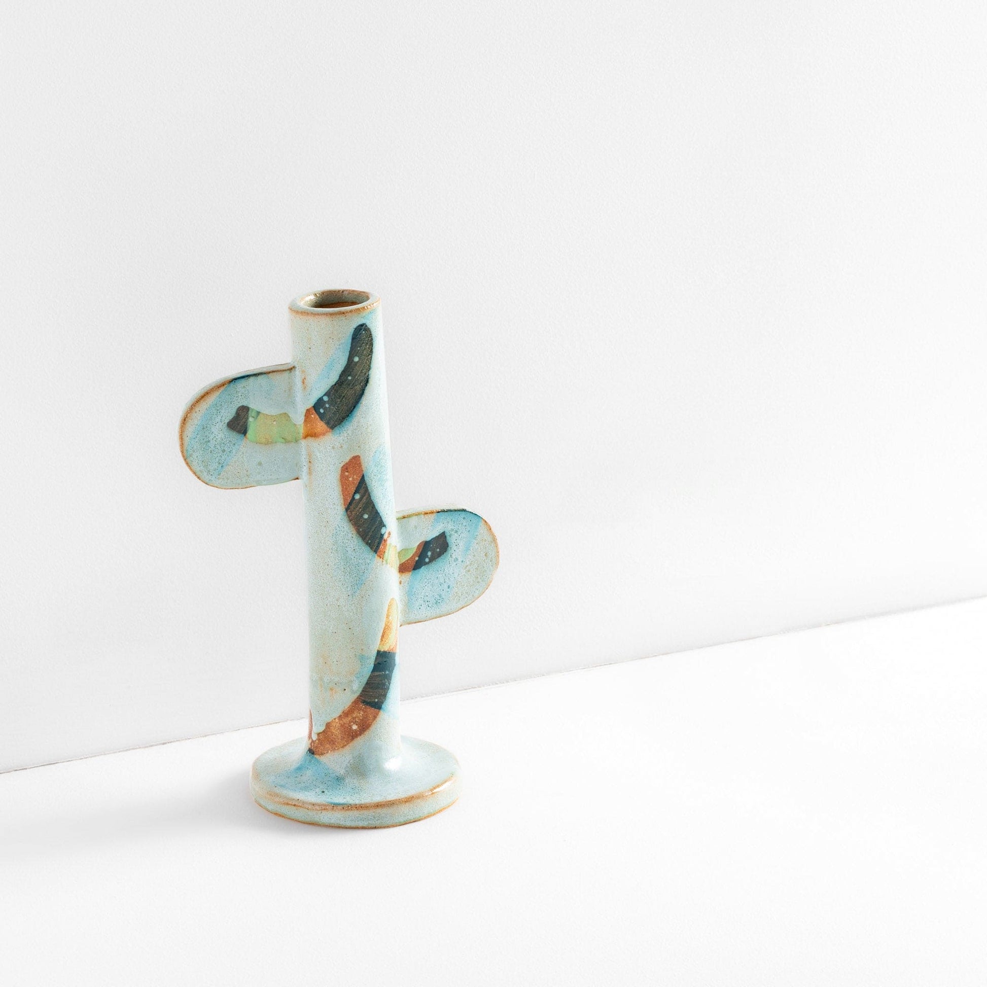 Ceramic stoneware candlestick holder with teal glaze, coloured slips and wax resist design. Handmade at Common Clay studio.