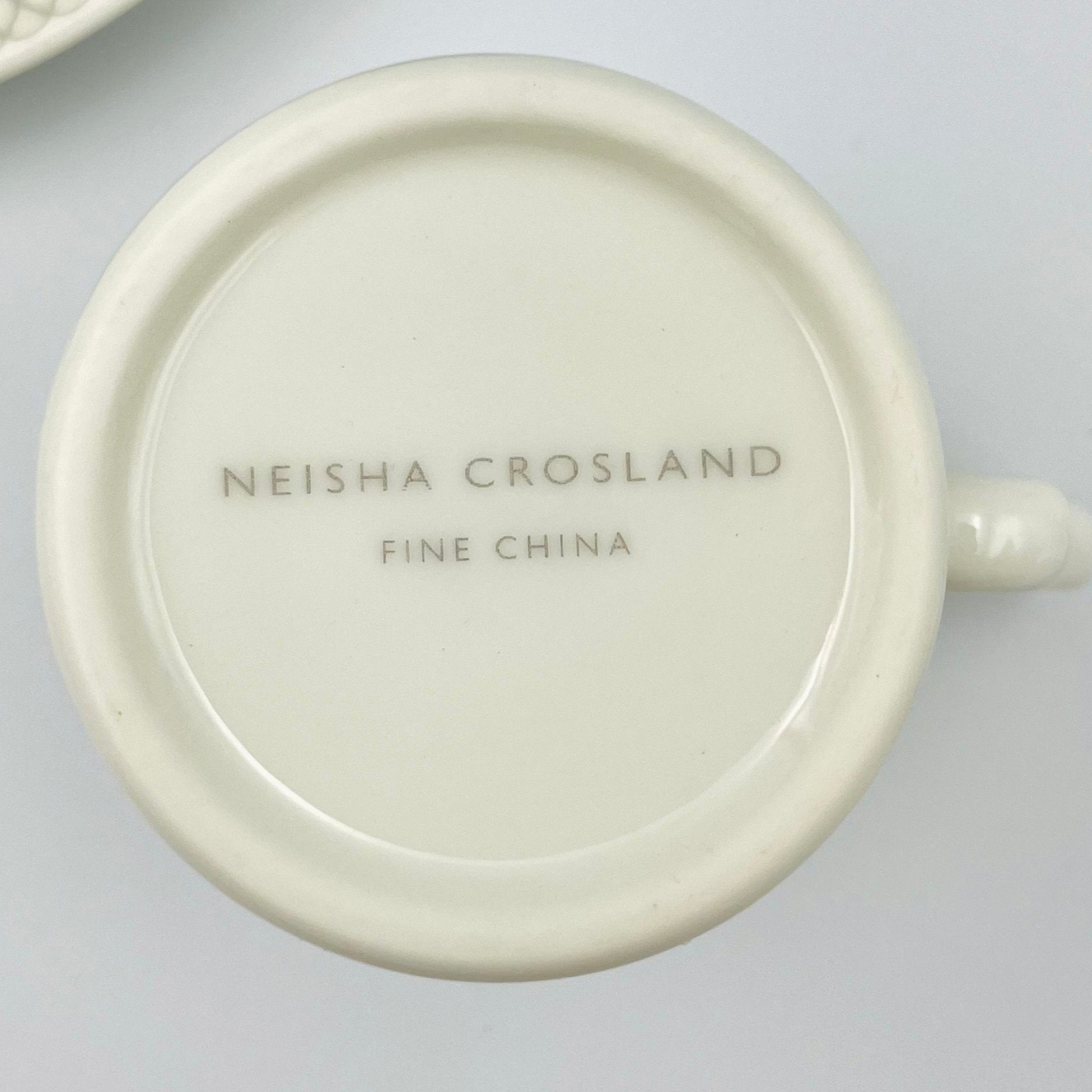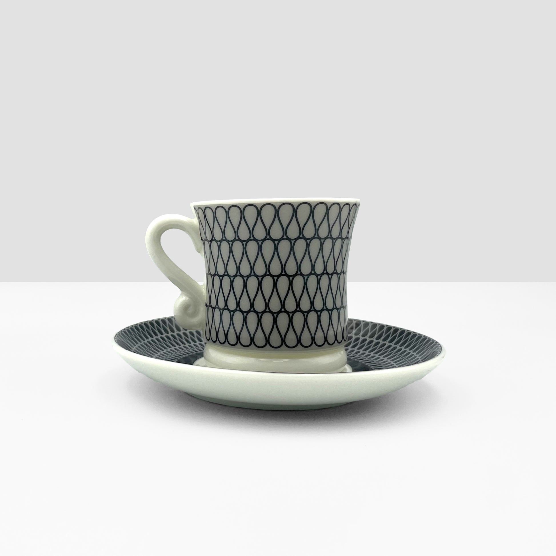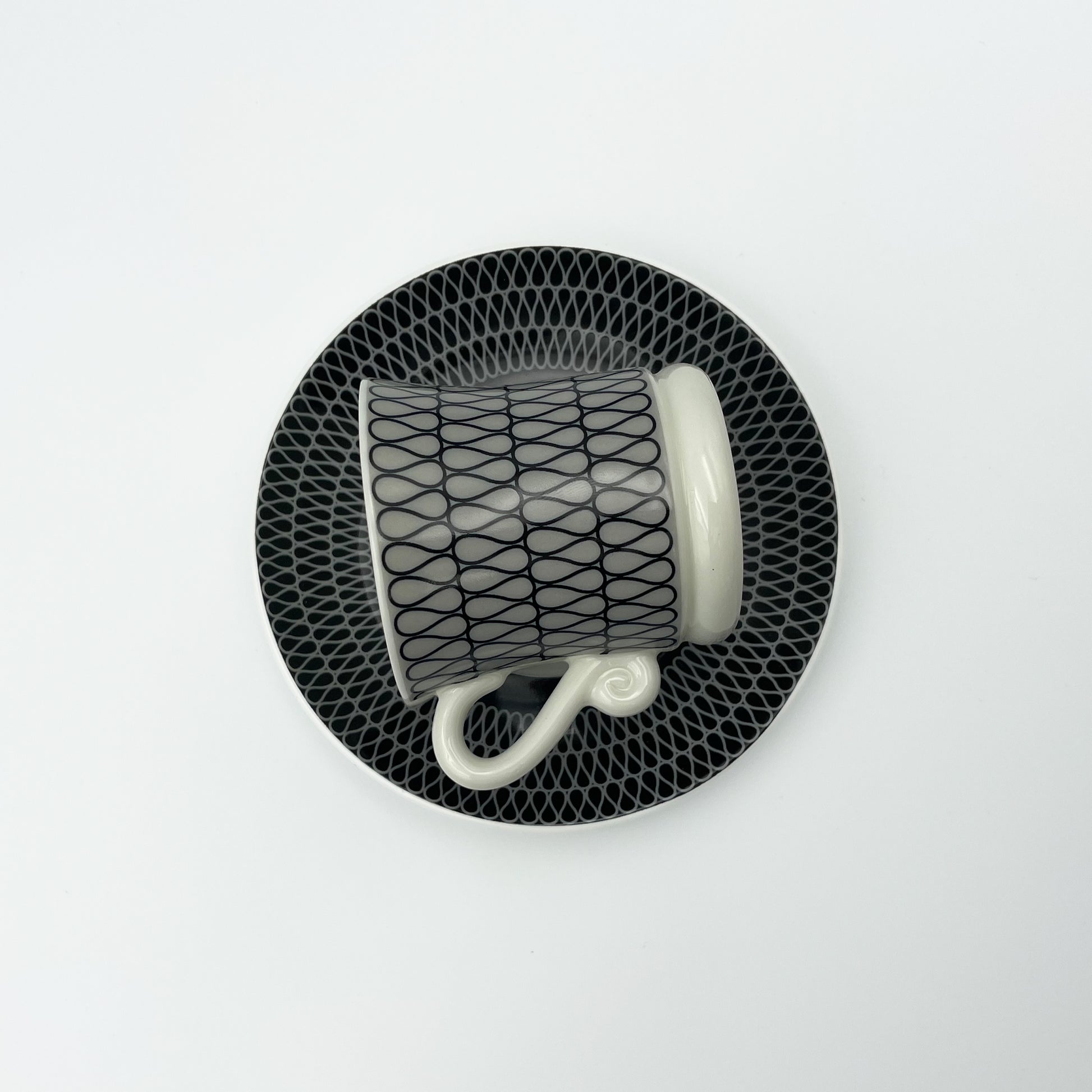 Beautiful set of four Neisha Crosland espresso cups and saucers in a striking black and grey pattern. Ideal for any coffee connoisseur when entertaining friends or just for the pick me up morning espresso.