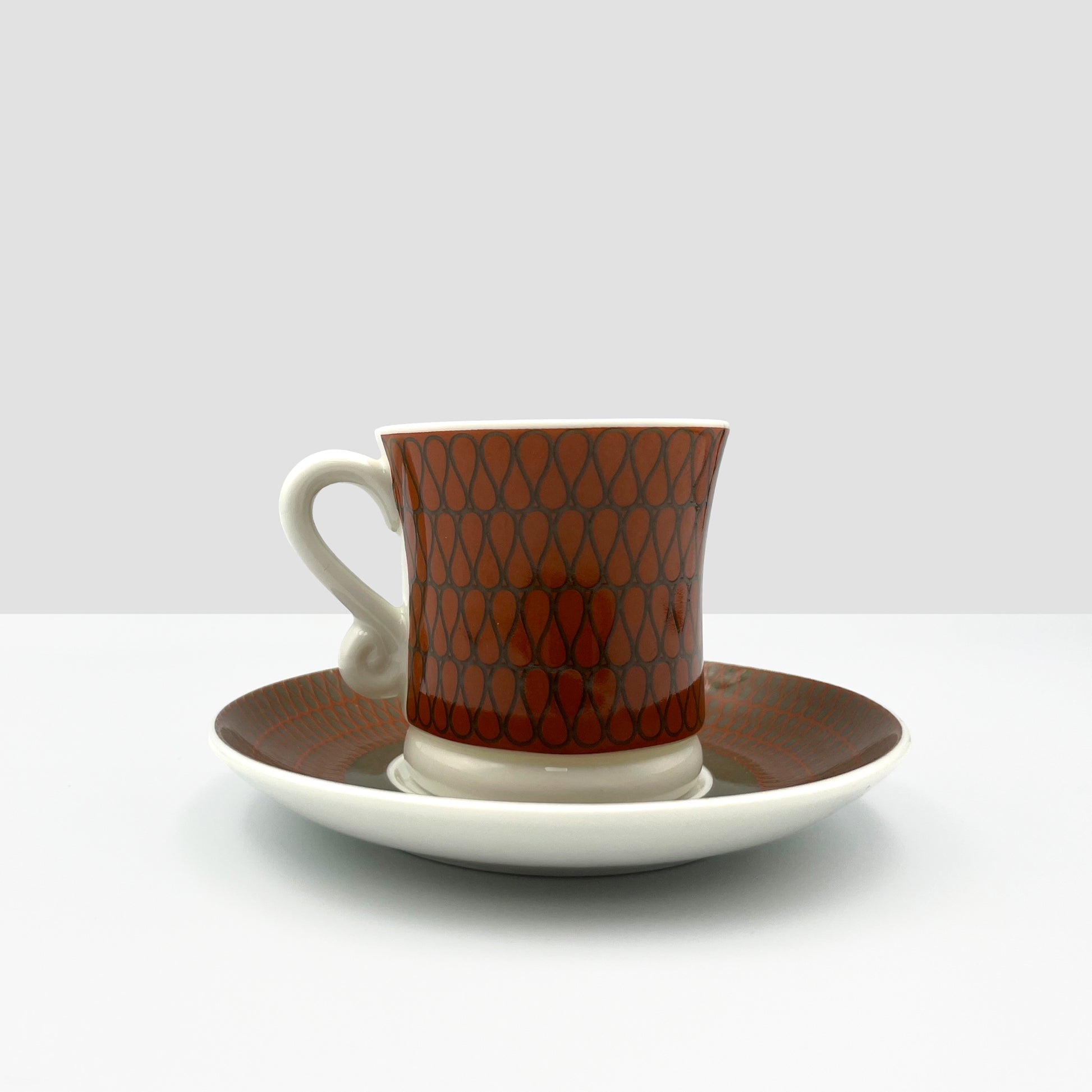 Beautiful set of four Neisha Crosland espresso cups and saucers in a striking orange and black pattern. Ideal for any coffee connoisseur when entertaining friends or just for the pick me up morning espresso.