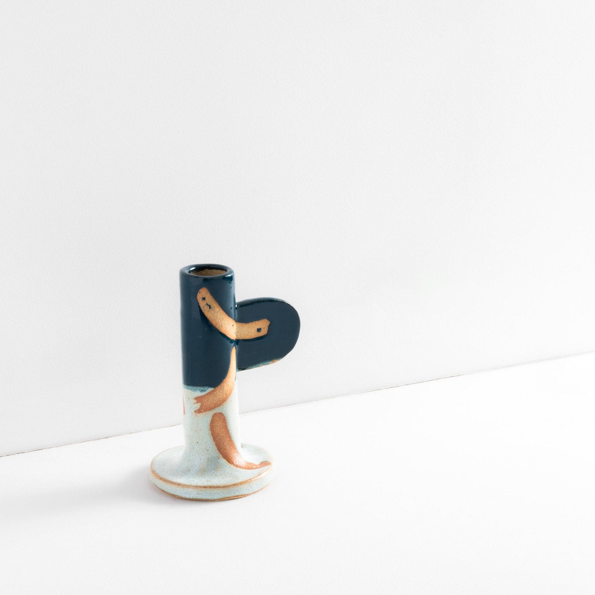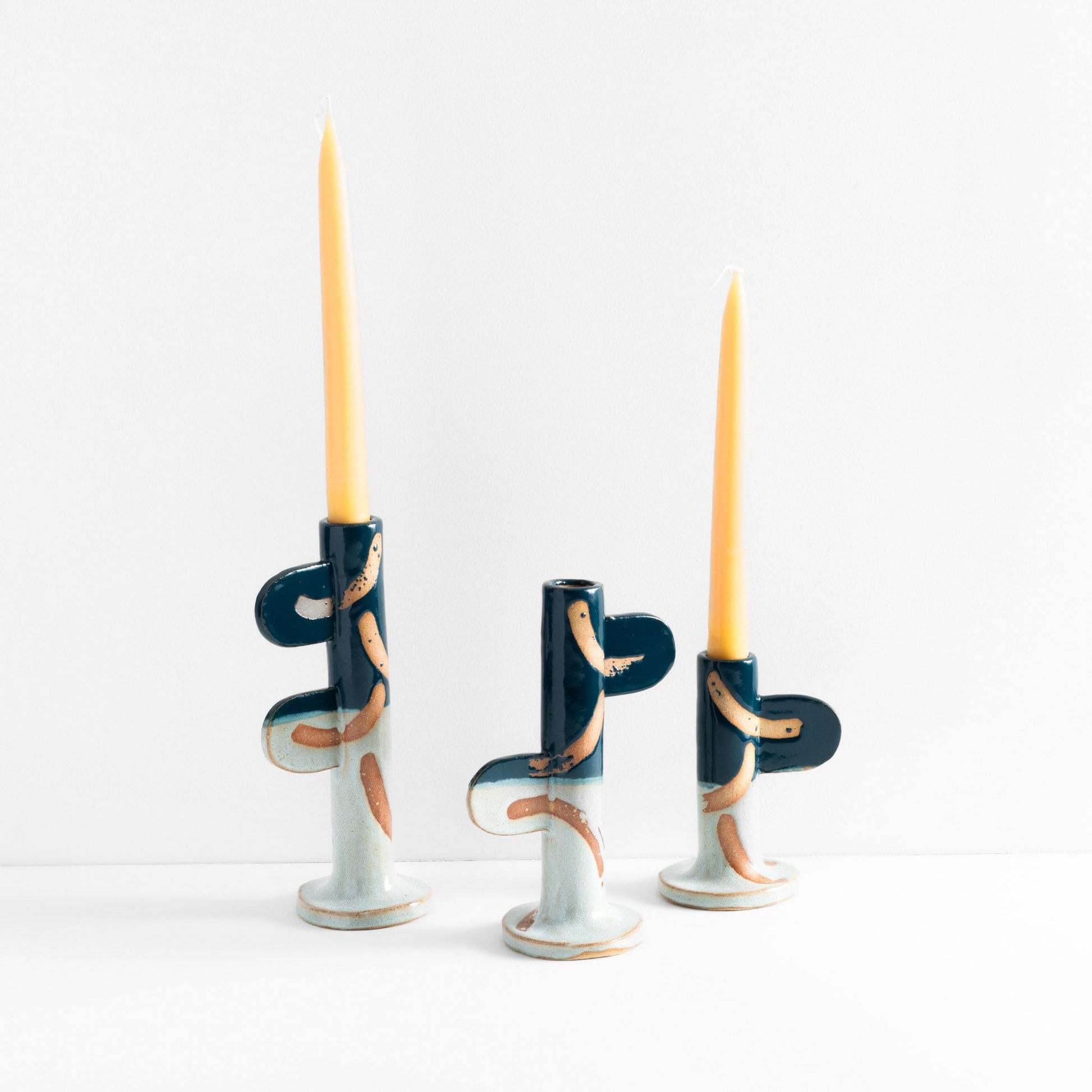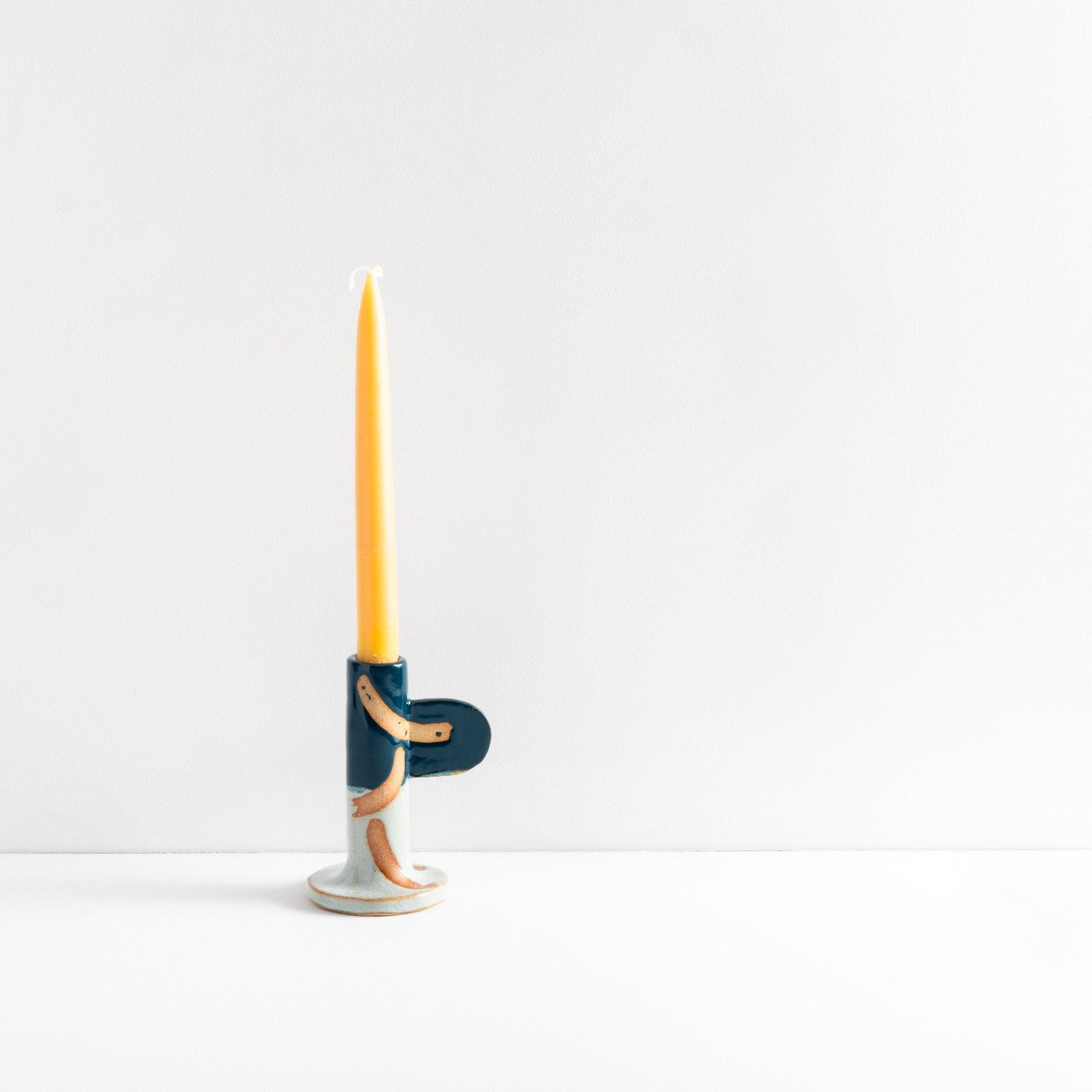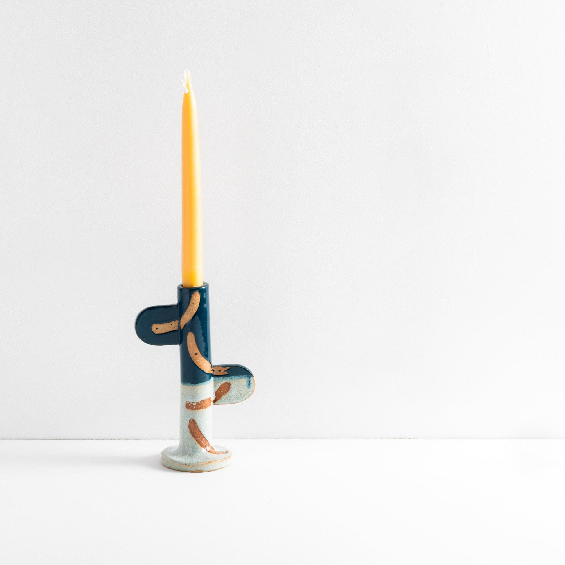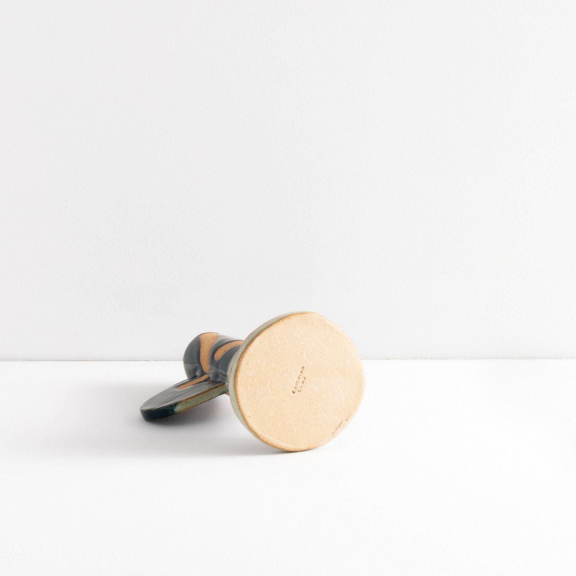 Ceramic stoneware candlestick holder with green glaze and wax resist design. Handmade at Common Clay studio.