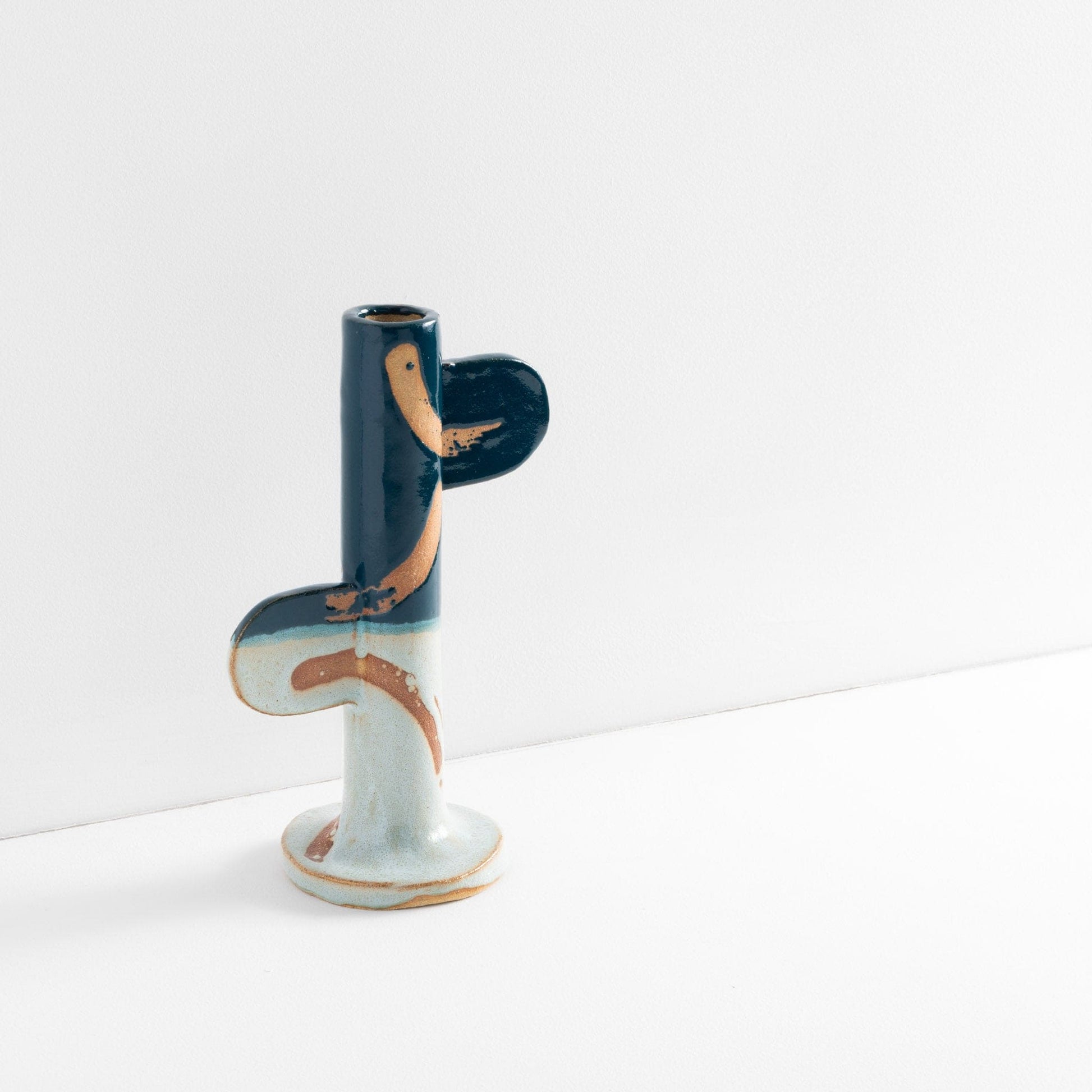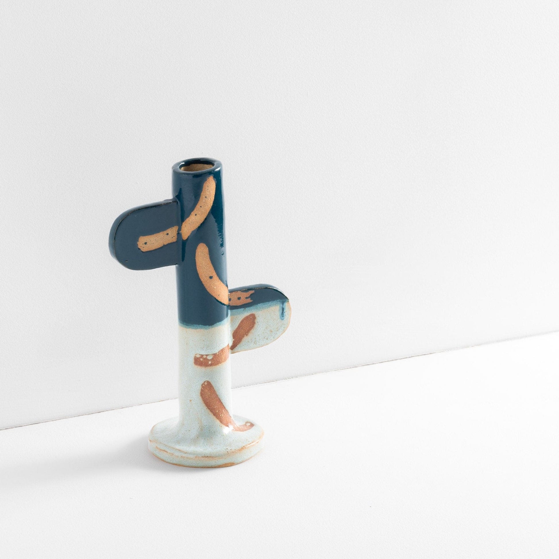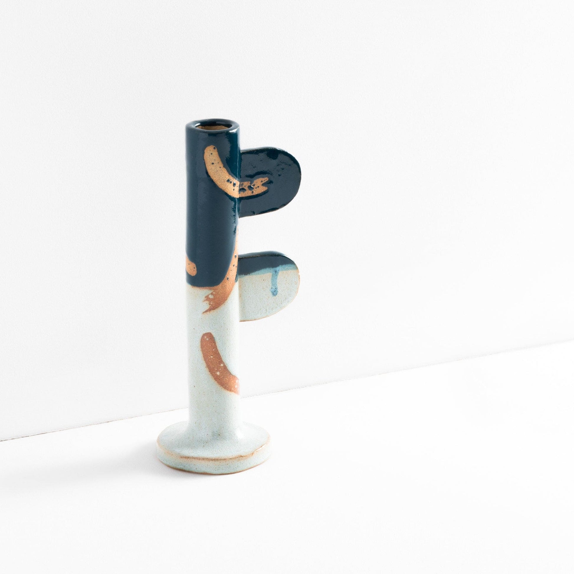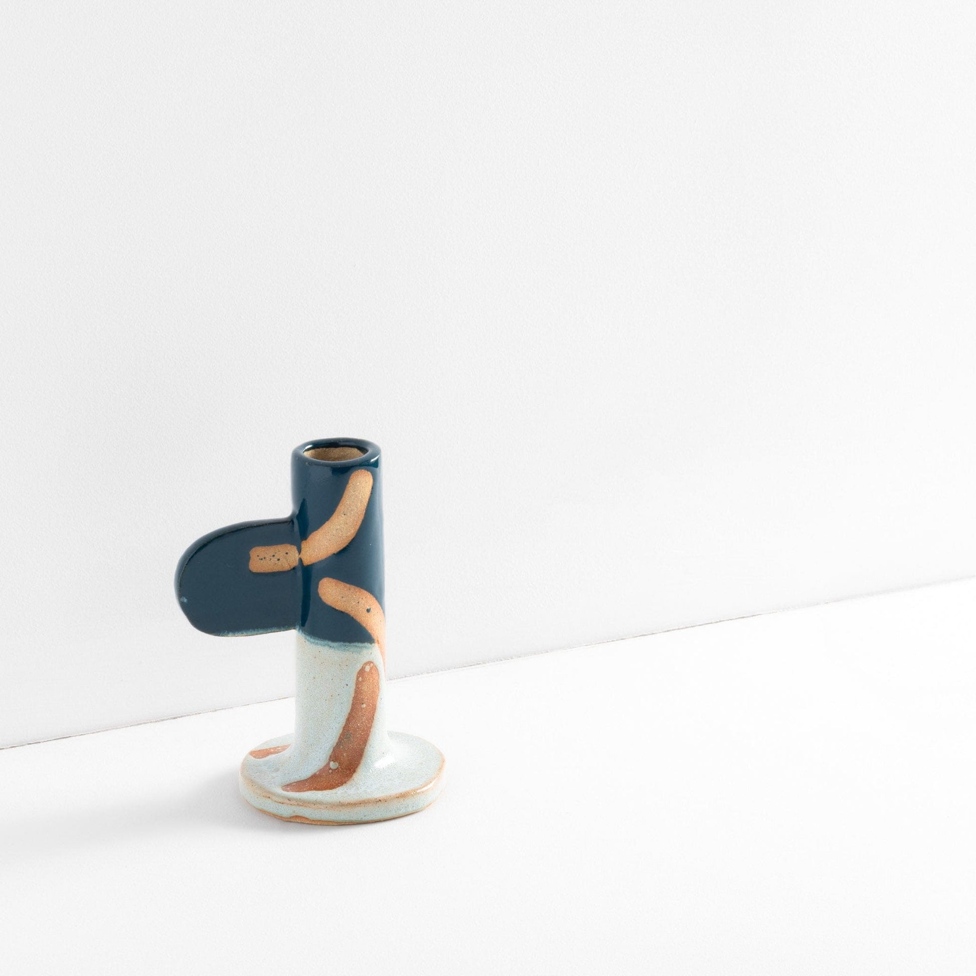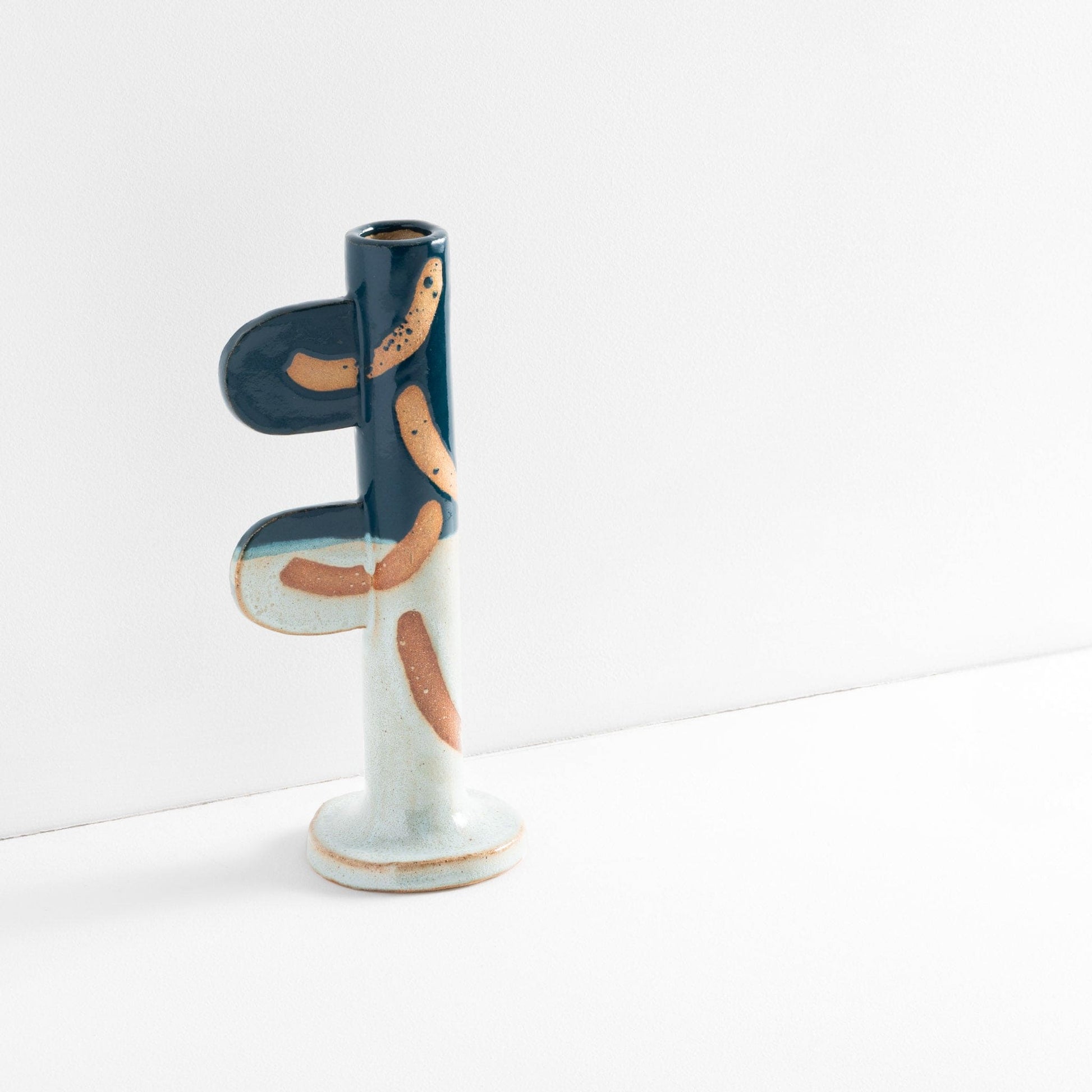 Ceramic stoneware candlestick holder with green glaze and wax resist design. Handmade at Common Clay studio.
