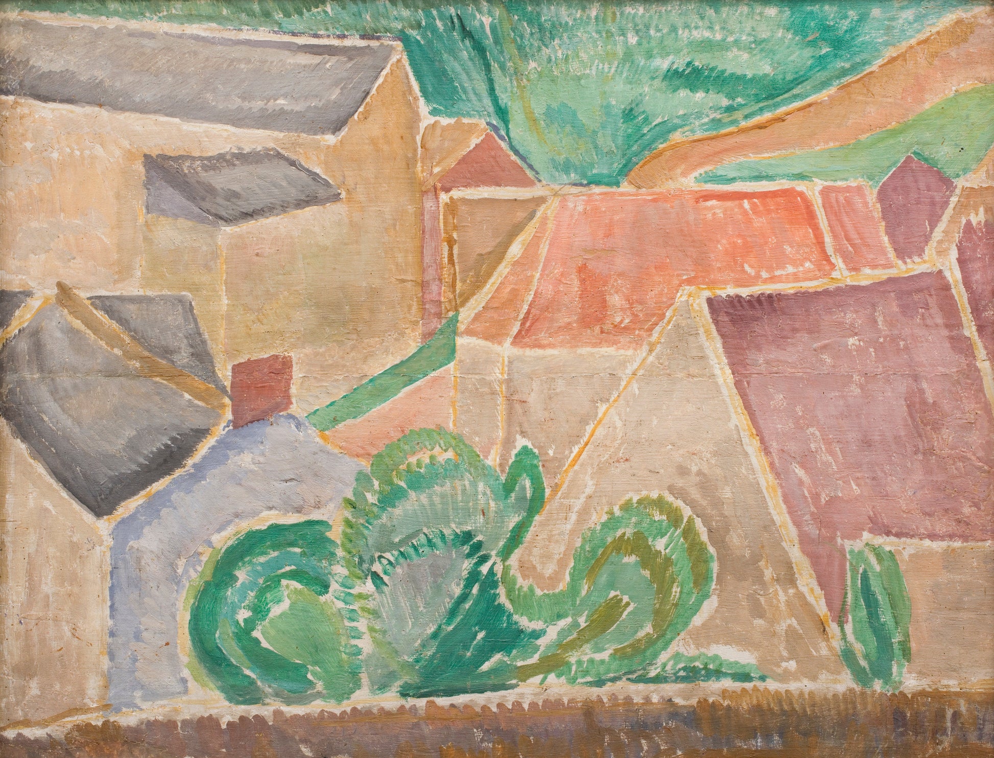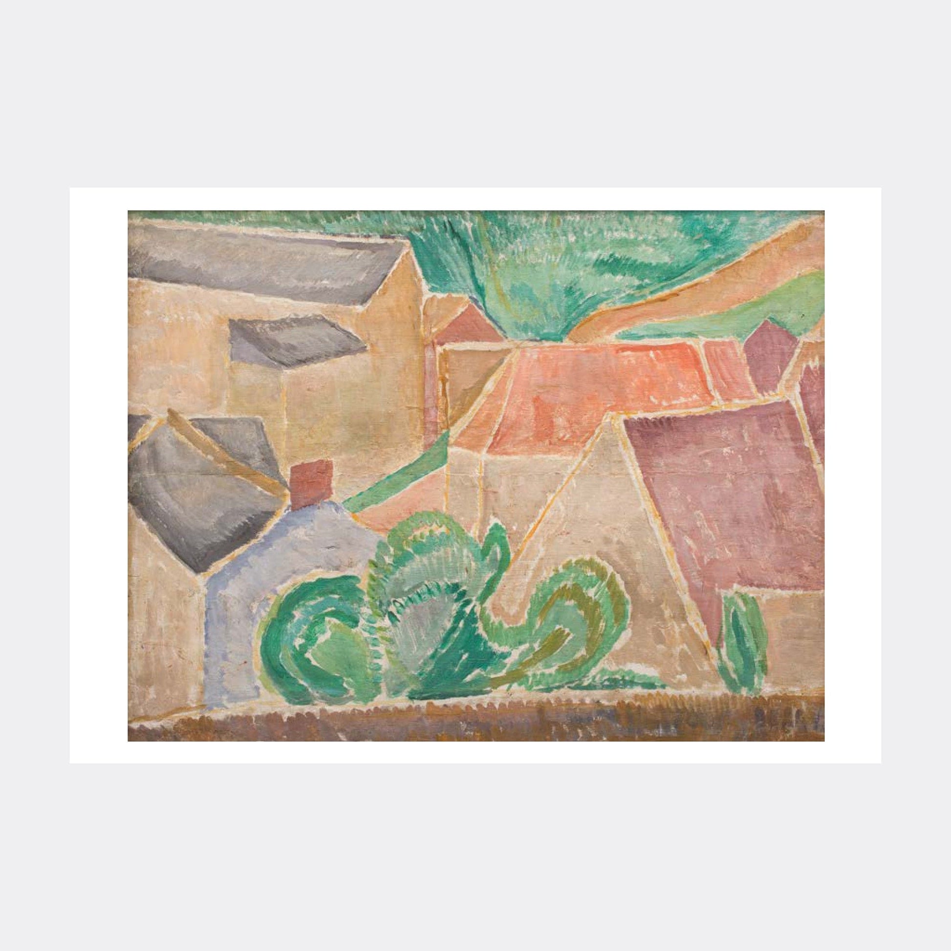 Vanessa Bell, Landscape with Buildings, 1912, oil on plywood. A6 postcard.