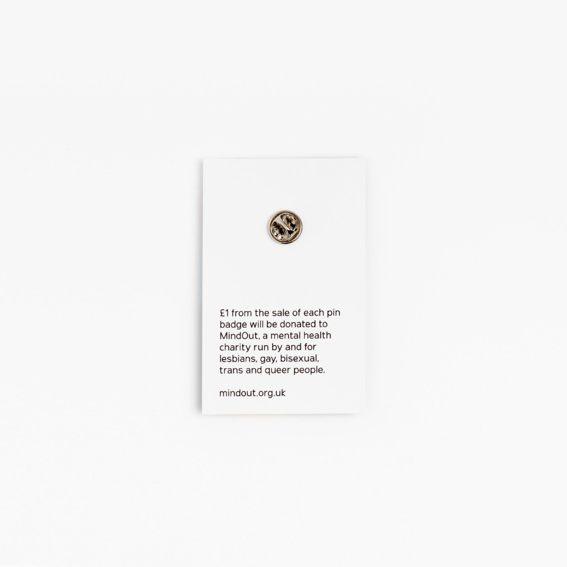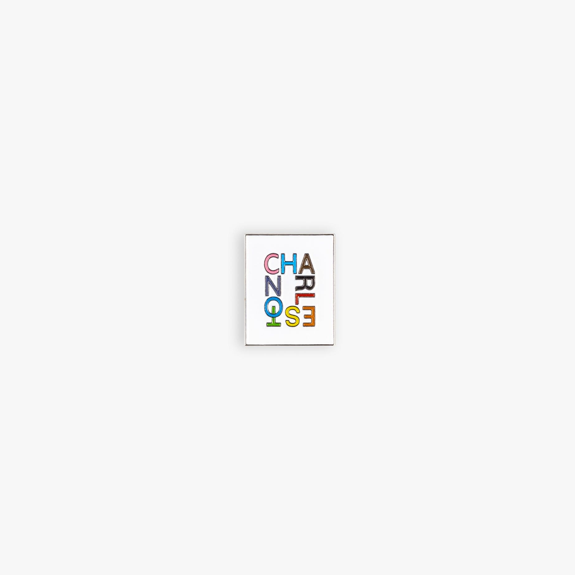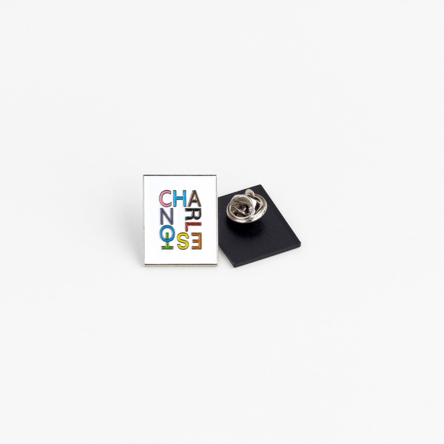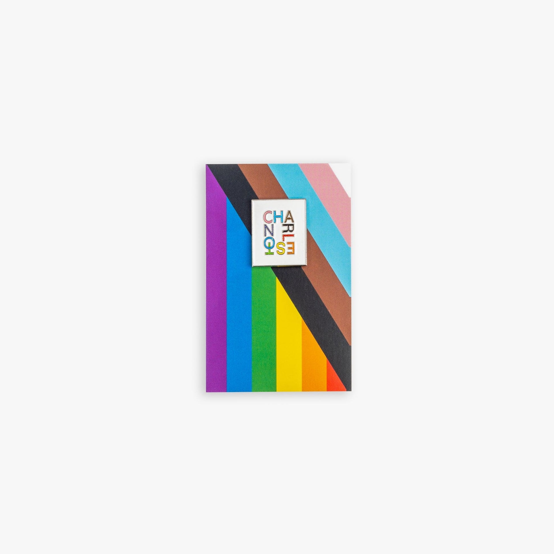 Enamel pin badge with Charleston logo in Progress Pride colours on white background.
