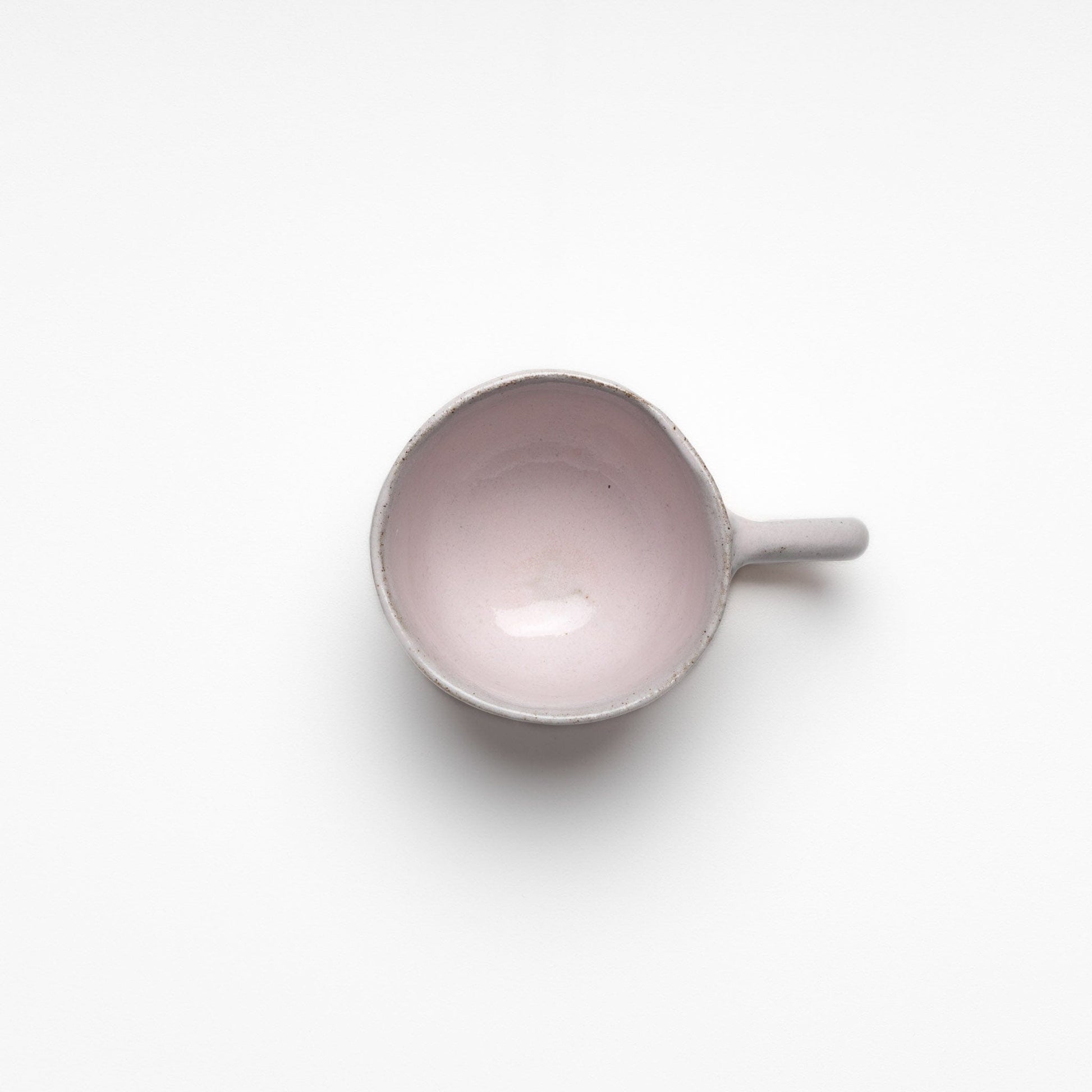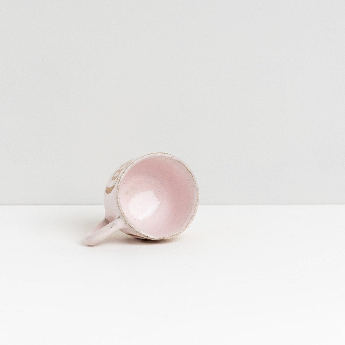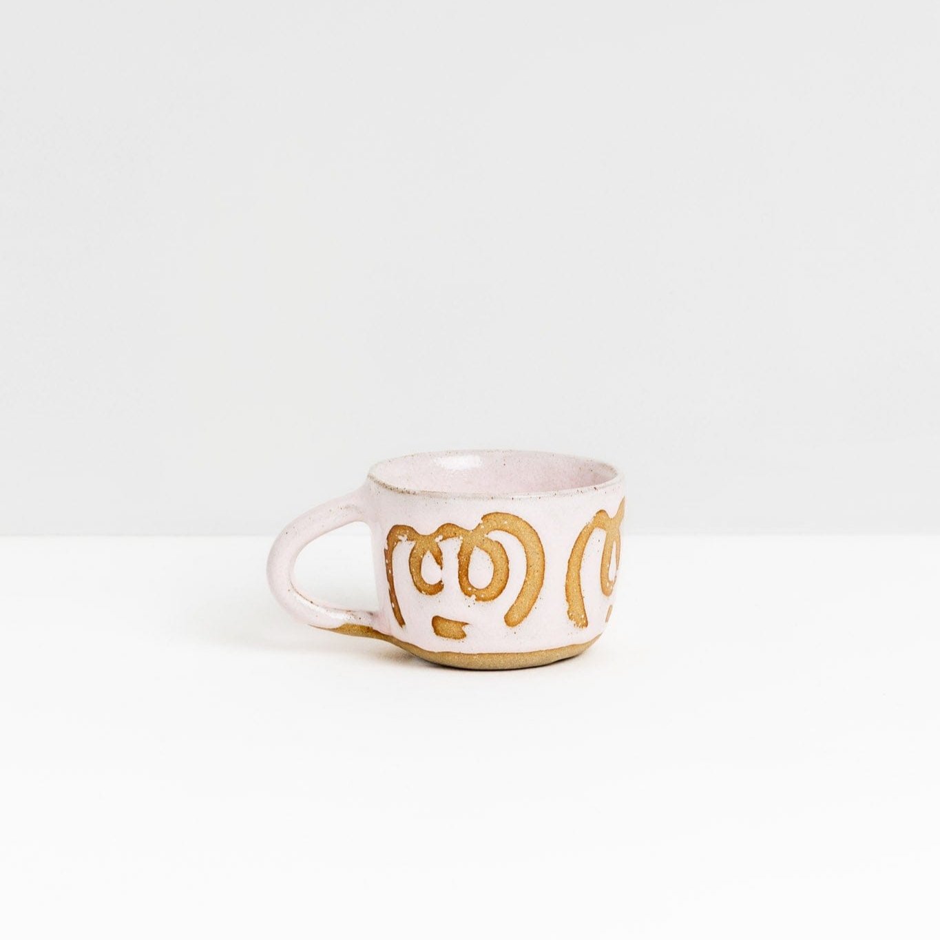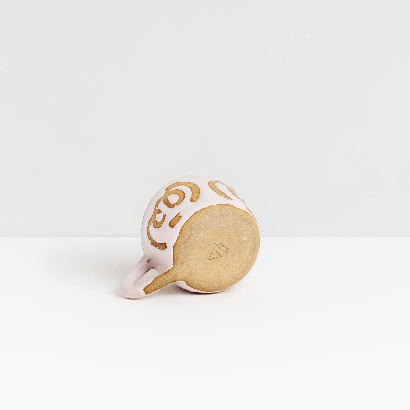 Ceramic stoneware cup with light pink glaze and wax resist design. Handmade at Common Clay studio.