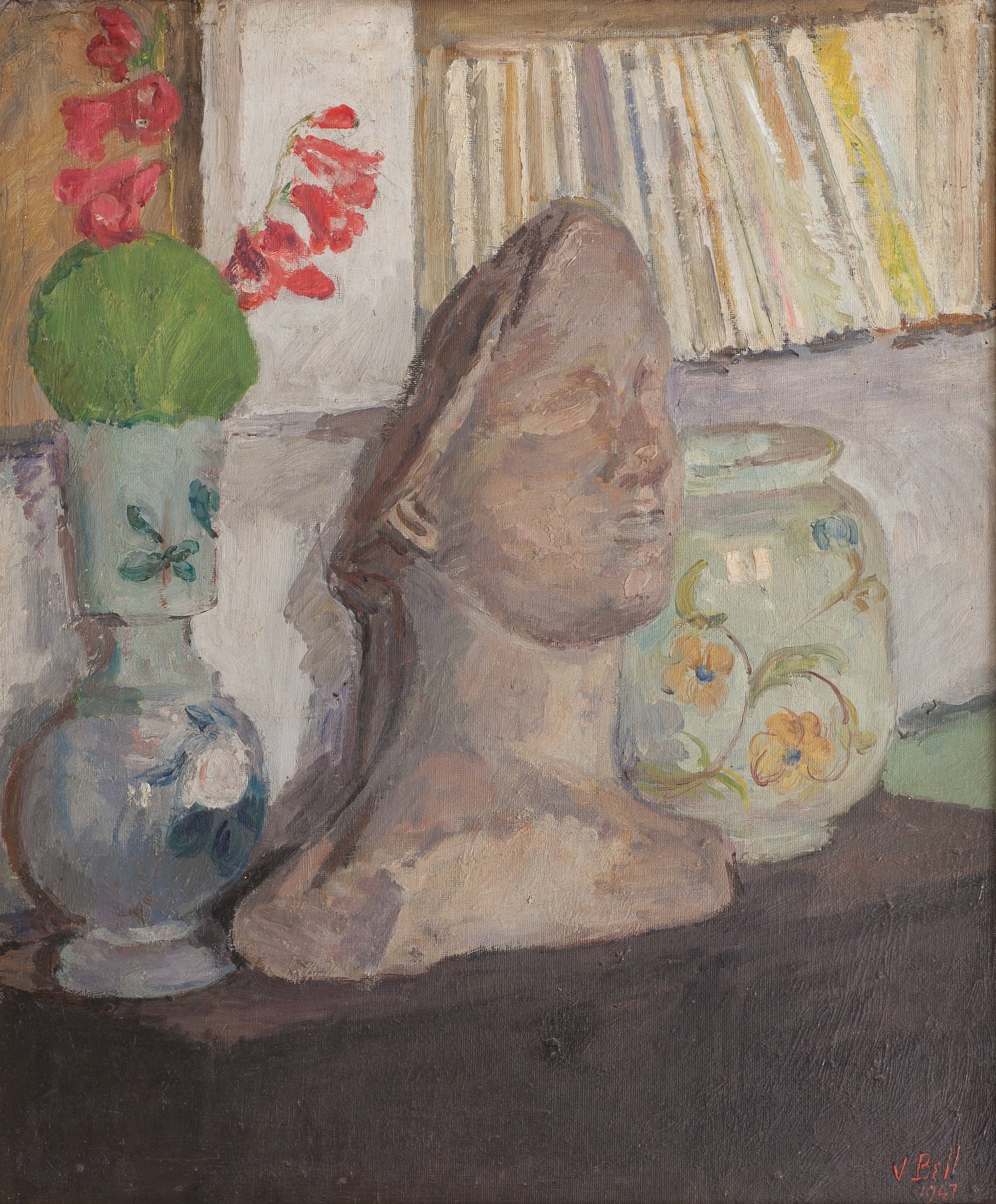 Vanessa Bell, Still Life with a Plaster Head, 1947, oil on board. A6 postcard.